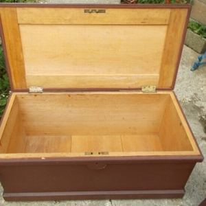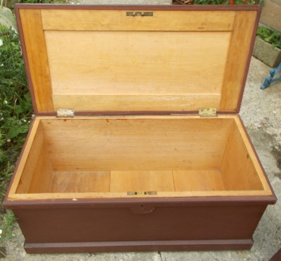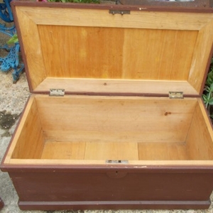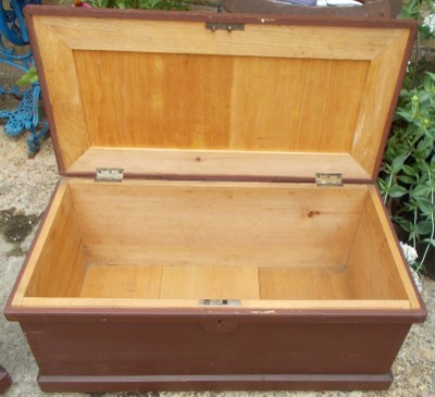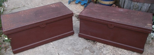 Lovely pair of Victorian pine, painted, boxes. Very unusual to get a matching pair and so clean inside. They are very well made with added support inside the lid. The plinth continues all the way around the bottom and there is a bar at the back to prevent the lid from going right back and breaking the hinges. Size of each one is 36ins. wide x 18ins. deep x 16ins. high. Stock no 2294