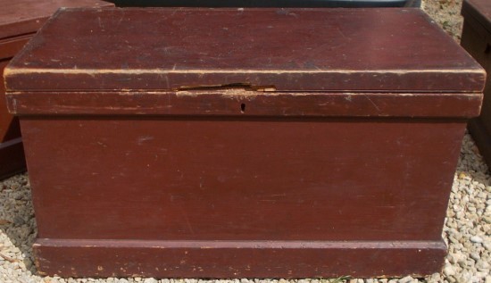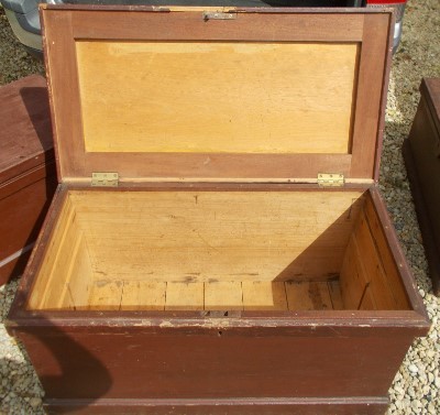 Victorian painted pine box - unfortunately some silly person has damaged the front top to gain access (as shown) but a nice sturdy box that could easily be put right. Size 37ins. wide x 19.25ins. deep x 20ins. high. Stock no. 2291