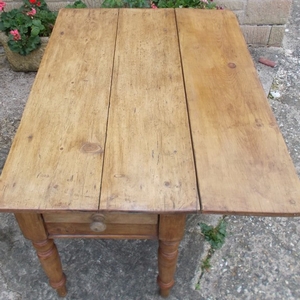 Victorian, pine, single drop-flap table. This would have had two flaps originally but it was used to put against a wall with just one flap in use. One useful end drawer. Size 42ins x 21.5ins. (31.5ins. with the flap in use) x 28.25ins high. Stock no 1542
