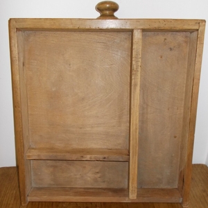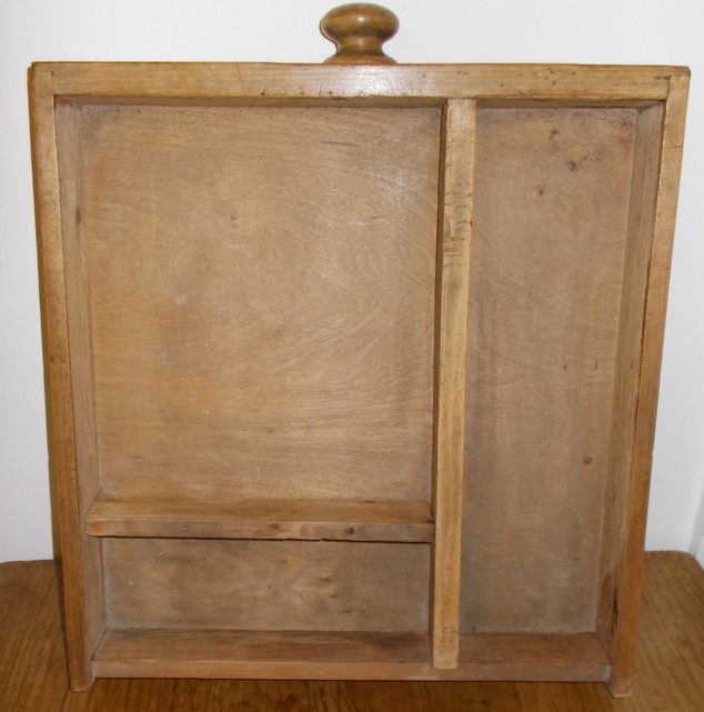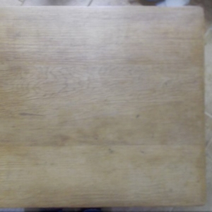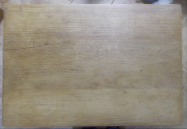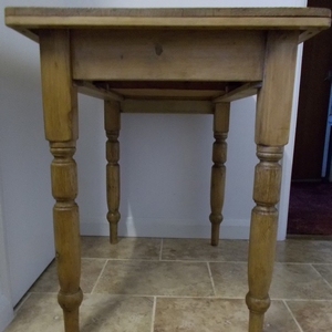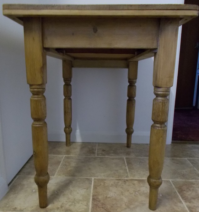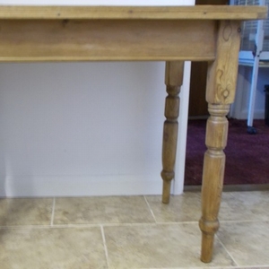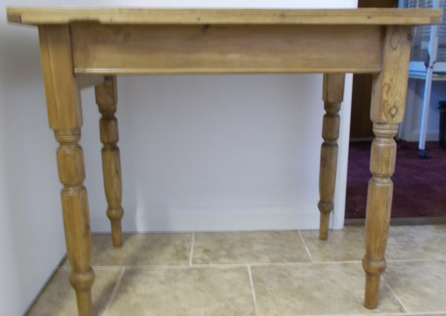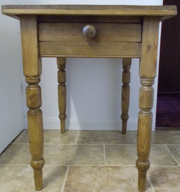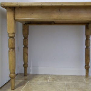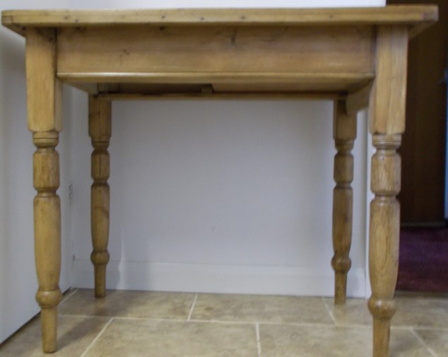 Nice small, Victorian, pine table with drawer (with sections) Under the outside of the top is strengthened with strips of wood because people oftern attached mincers etc. to the table so one side shows that a piece of wood has had damage. Size 35.75ins. x 24.5ins x 30ins high - the height under the drawer end is 22.5ins and the other three side are a good height of 24.5ins) Stock no 2316 SOLD
