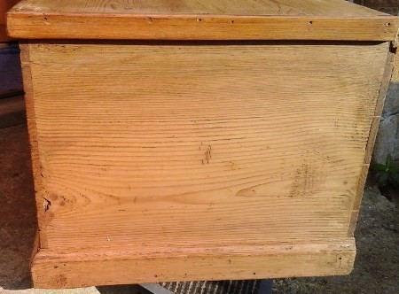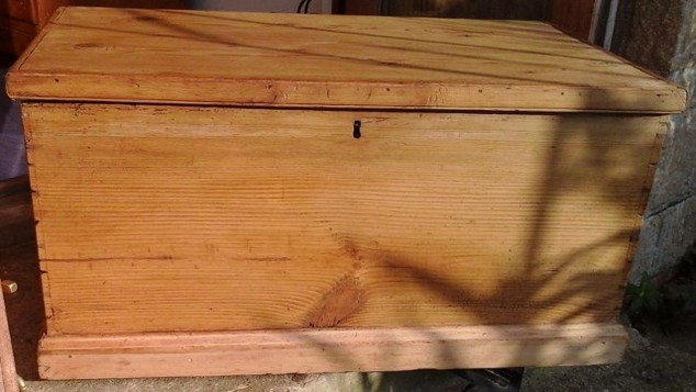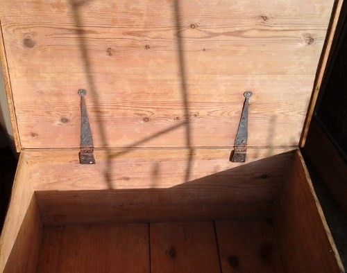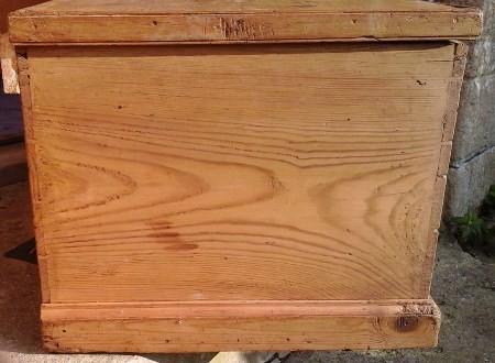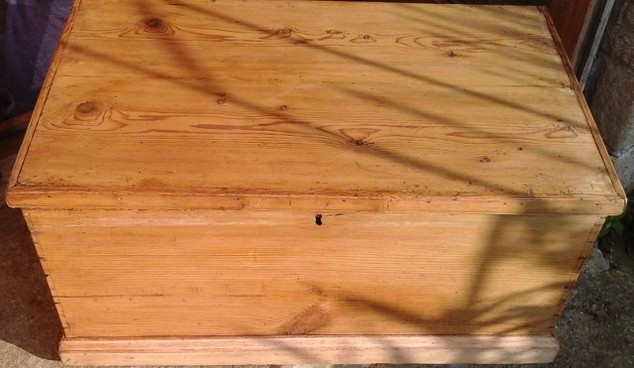 Victorian, antique pine box - has had a replacement trim to one side and a piece of wood at the back to make sure the top isn't forced back too much. Size 30.75ins.wide x 19ins. deep and 15.25ins. high overall. Stock 2172