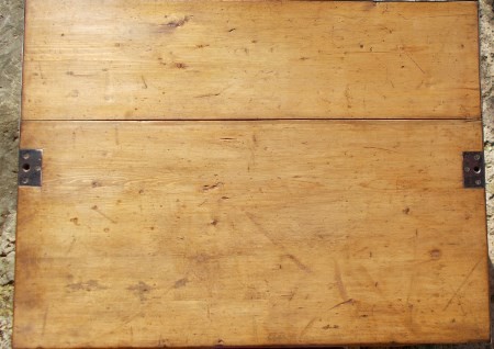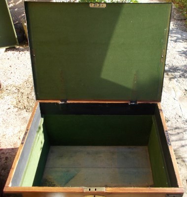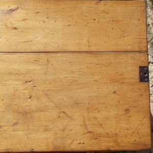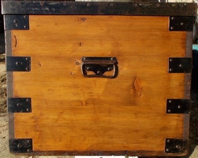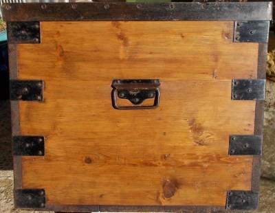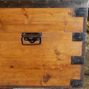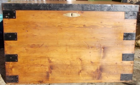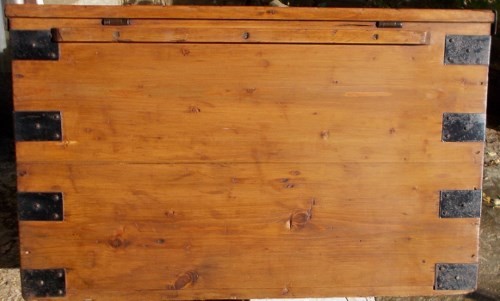 Lovely Victorian pine chest made specifically to store silverware as it has it's original key but the metal fixtures to each side are missing the screws. Nice heavy duty iron handles at each end and the metal corner bands are in good condition. At the back is a strip of wood to stop the lid going back too far. Size 31.25ins. wide x 23.5ins. deep x 19.25ins.high. Stock 2240 SOLD