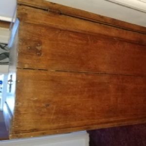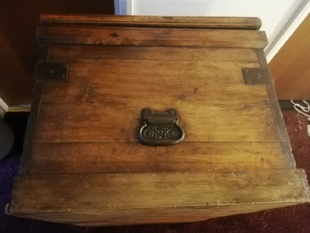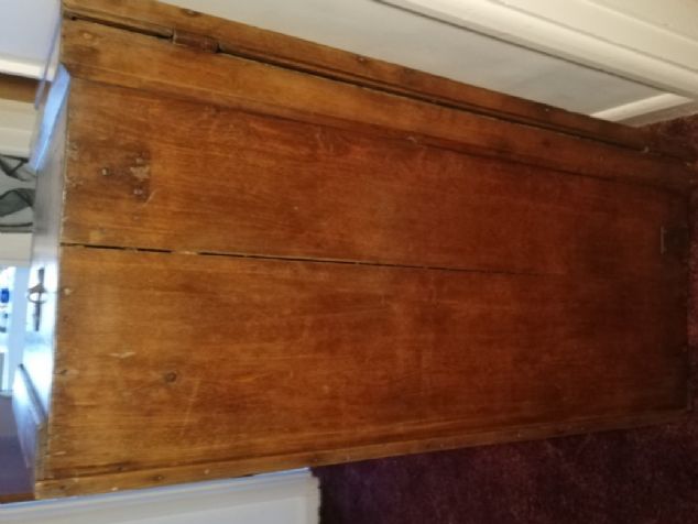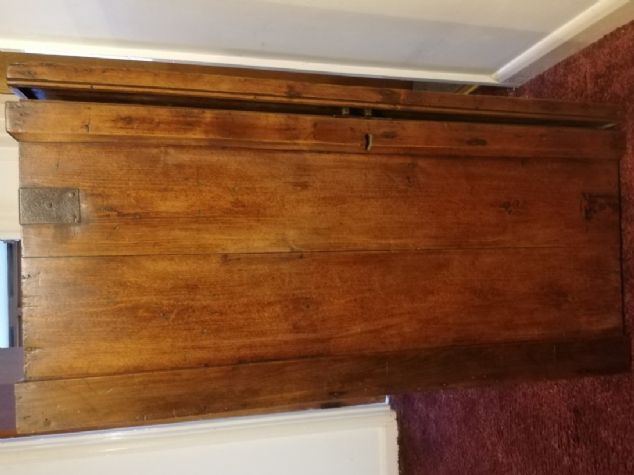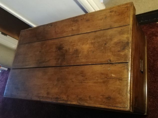 Victorian pitch pine blanket box. The first picture was taken before being cleaned and polished. One handle is complete but the other is just the broken back plate. Also not all the corner metals are there. This is a very heavy box.